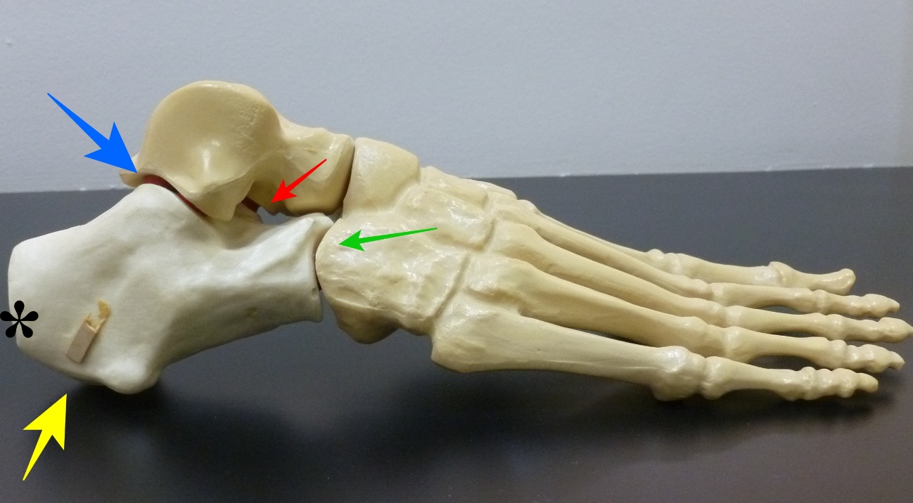 Seta amarela: osso calcâneo; Seta azul: articulação subtalar posterior; Seta vermelha: articulação subtalar média; Seta verde: articulação calcaneocuboide; * inserção do tendão de Aquiles